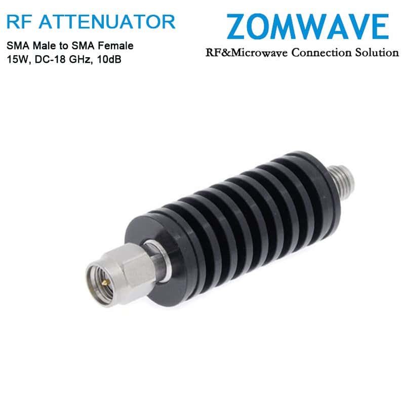 10dB Fixed Attenuator, SMA Male to SMA Female, 15Watts, DC-18 GHz, VSWR