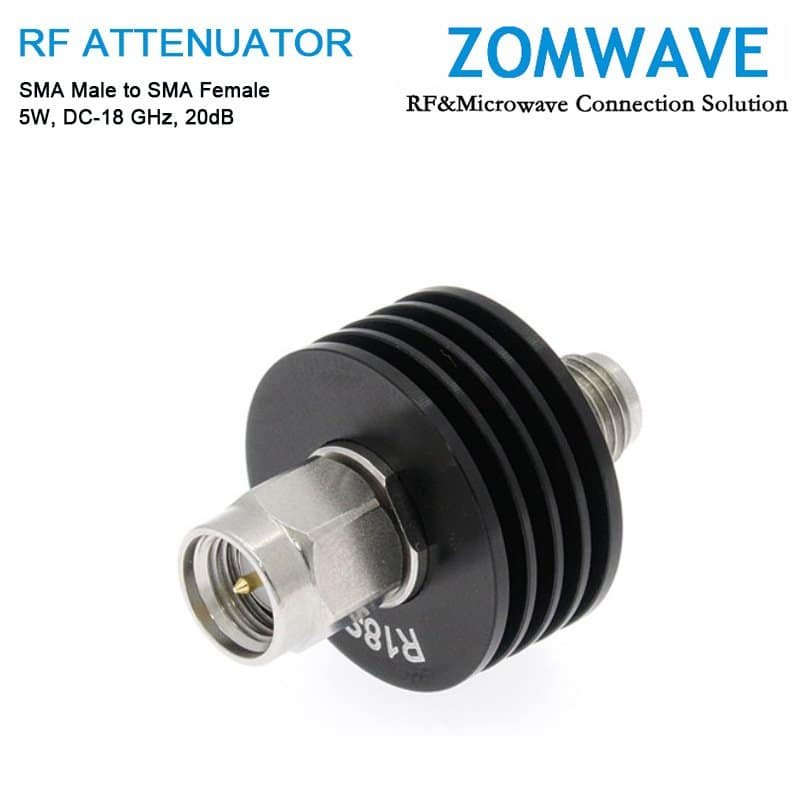 20dB Fixed Attenuator, SMA Male to SMA Female, 5Watts, DC-18 GHz, VSWR