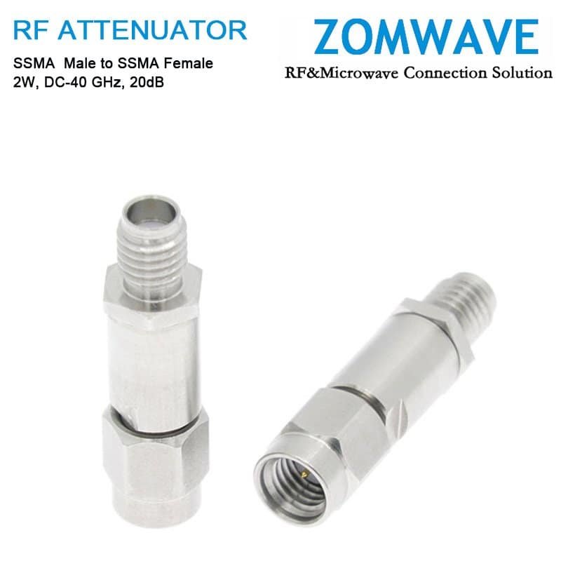 20dB Fixed Attenuator, SSMA Male to SSMA Female, 2Watts, DC-40 GHz, VSWR