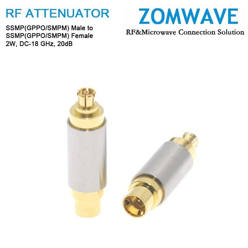 20dB Fixed Attenuator, SSMP(GPPO/SMPM) Male to SSMP(GPPO/SMPM) Female ,2Watts, DC-18 GHz, VSWR