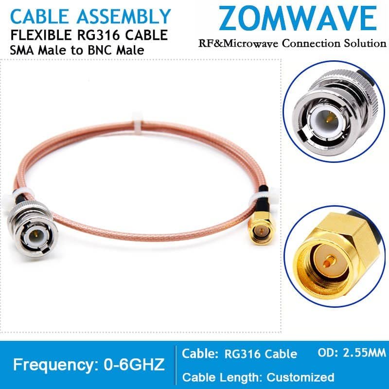 No MOQ, 5 days Shipping out, 100% fully tested to ensure high quality. SMA Male to BNC Male, RG316 Cable. ZOMWAVE RG316 flexible coax cable is 50 Ohm and has a PTFE dielectric. Our RG316 coax is constructed with a 0.102 jacket made of FEP, assemblies are part of over 40,000 RF, microwave and millimeter wave components. ZOMWAVE coaxial cable assembly products are suitable for automobiles, broadband, industry 4.0, instrumentation, medical treatment, military, quantum computing, smart agriculture, 5G wireless, etc. The SMA Male to BNC Male, RG316 Cable assembly is composed of Flexible RG316 Cable. The Flexible RG316 Cable. are perfect for interconnection of coaxial components or sub-systems connection. The cable construction includes a silver-plated copper-clad steel center conductor, low loss PTFE, and tin overcoated copper shield braiding, which minimizes signal leakage. Connectors have brass, nickel plated coupling nut over a gold plated connector body that make the connection more reliable. The Flexible RG316 Cables are available in variety of length to meet your requirements. Variations of SMA to BNC cable assemblies can also be manufactured and will be shipped within 5 days.