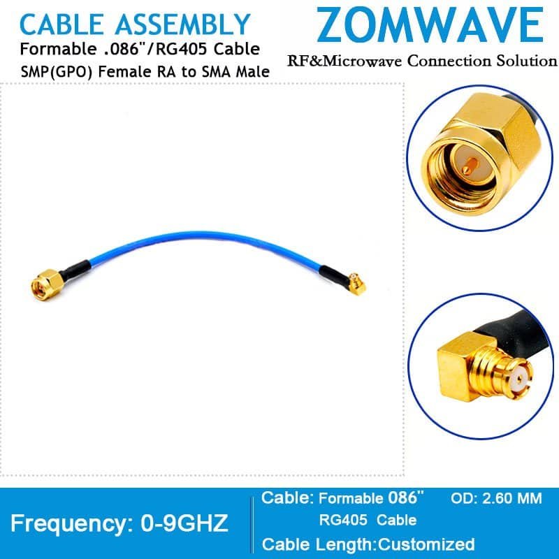No MOQ, 5 days Shipping out, 100% fully tested to ensure high quality. SMP(GPO) Female Right Angle to SMA Male, Formable .086”/RG405 Cable, assemblies are part of the largest coaxial cable selection for RF, microwave and millimeter wave interconnect solutions. ZOMWAVE coaxial cable assembly products are suitable for automobiles, broadband, industry 4.0, instrumentation, medical treatment, military, quantum computing, smart agriculture, 5G wireless, etc. The SMP(GPO) Female Right Angle to SMA Male cable assembly is composed of Formable 086”/ RG405. The Formable 086”/RG405 Cable are perfect for interconnection of coaxial components or sub-systems connection. The cable construction includes a silver-plated copper-clad steel center conductor, low loss PTFE, and tin overcoated copper shield braiding, which minimizes signal leakage. Connectors have brass, nickel plated coupling nut over a gold plated connector body that make the connection more reliable. The Formable 086”/RG405 Cable Cable are available in variety of length to meet your requirements. Variations of smp cable assemblies can also be manufactured and will be shipped within 5 days.